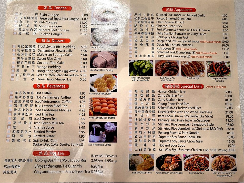 Introducing the menu at Sam Woo Cafe, a seafood and dessert haven located in Artesia, CA. This casual spot offers accessible parking, waiter service, and a dog-friendly atmosphere. Customers rave about the fresh dim sum options, such as pork siu mai and shrimp dumplings. The ambiance is modern yet culturally infused, making it a delightful dining experience. The menu includes favorites like garlic snow peas, scallop and shrimp siu mai, and spicy wontons. Don't miss out on the crispy fried shrimp balls or the delectable chicken curry. With reasonable prices and efficient service, Sam Woo Cafe is the go-to spot for satisfying your dim sum cravings without the hustle and bustle of traditional dim sum carts. A must-visit for any seafood lover or dessert enthusiast.